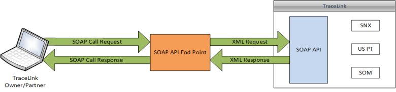 TraceLink communicates with certain operating systems or programs of choice through SOAP (XML-based messaging protocol) integration. As indicated in the diagram below, the TraceLink applications that use the SOAP API are Serialized Operations Manager, Serial Number Exchange, and Product Track.