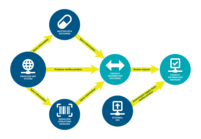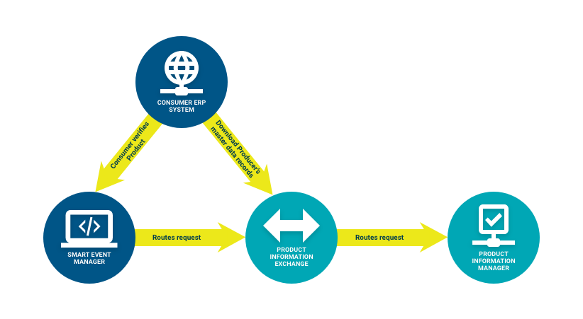 Consumers configure their ERP system to call the Smart Event Manager API to verify against the product directory records and serial number information provided by Producers (Pharmaceutical Manufacturers, Repackagers) in Product Information Manager. They can also view verification histories through Product Information Exchange. The US DSCSA requires Consumers to verify that returned products are still valid, according to the Producers who manufactured the products, before these products can be resold.
