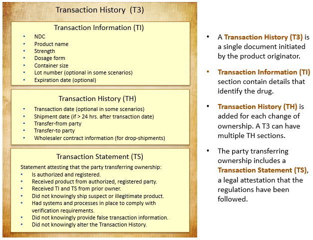 For the final regulation, the transaction history portion of the T3 is deprecated. Instead, supply chain partners exchange T2 information (Transaction Information and the Transaction Statement) and serialization information electronically.